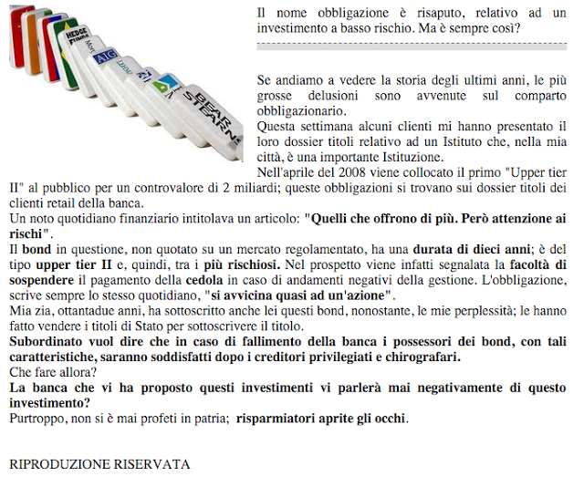 Questo post è raccomandato a tutti i risparmiatori che oggi sono in tensione con i loro investimenti. Ho ricevuto molte telefonate, in questi giorni, per l’amico, il suocero, la zia etc. Tutti mi chiedevano se avessero sottoscritto obbligazioni subordinate.