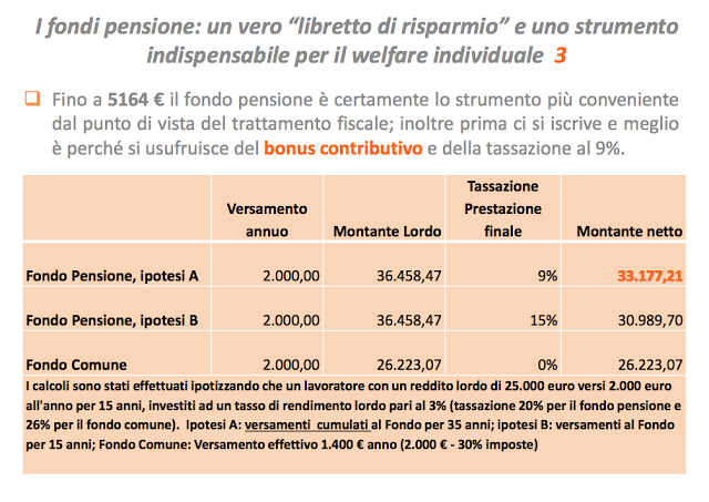 Quello che riportiamo non è una novità. Ma forse “qualcuno” ancora non lo conosce. Prendiamo queste due slide presentate alla Giornata Nazionale della Previdenza per ribadire alcuni vantaggi fiscali. Che poi ci sia anche una forte necessità di colmare il Gap pensionistico è un bisogno che ognuno deve sentire e/o essere sensibilizzato. C’è molta strada da fare, anche nella trasparenza, ma è necessario incominciare ad essere più consapevoli di che cosa ci aspetta.