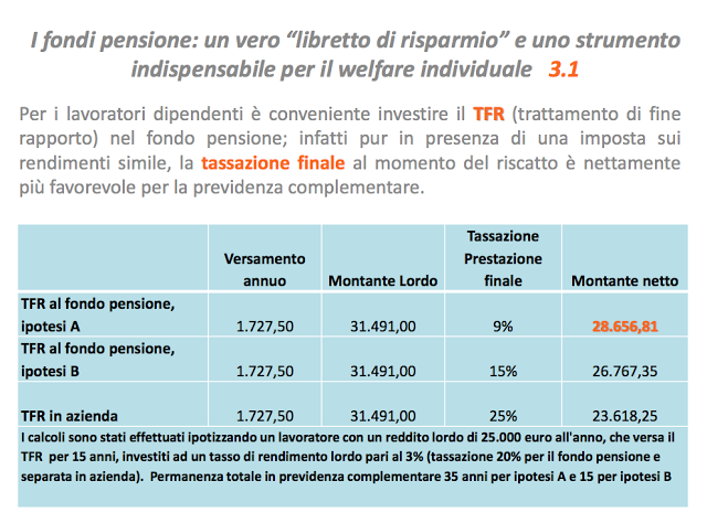 Quello che riportiamo non è una novità. Ma forse “qualcuno” ancora non lo conosce. Prendiamo queste due slide presentate alla Giornata Nazionale della Previdenza per ribadire alcuni vantaggi fiscali. Che poi ci sia anche una forte necessità di colmare il Gap pensionistico è un bisogno che ognuno deve sentire e/o essere sensibilizzato. C’è molta strada da fare, anche nella trasparenza, ma è necessario incominciare ad essere più consapevoli di che cosa ci aspetta.