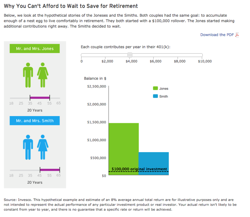 Perchè non possiamo più permetterci di procastinare le nostre decisioni sulla pensione. Qui di seguito due storie diverse ma simili; le famiglie Jones e Smiths. Entrambe le coppie avevano lo stesso obiettivo: accumulare un gruzzolo per vivere comodamente in pensione. Entrambi hanno iniziato con 100.000 Usd. La famiglia Jones ha iniziato ad accumulare da subito, la famiglia Smiths, invece, ha preferito aspettare.