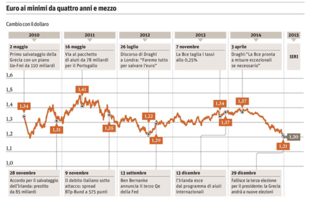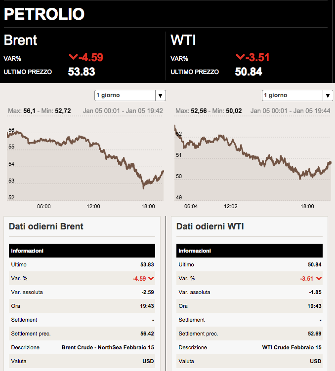 Primo: l’aumento dell’offerta. Proprio oggi il ministro del petrolio iracheno ha annunciato che il Paese, il secondo per importanza dell’Opec, intende aumentare a livelli record le esportazioni di greggio in gennaio, mentre la Russia ha registrato per il mese di dicembre il livello più alto di produzione dai tempi dell’Unione Sovietica. A questo si aggiunge il rifiuto dei sauditi di un taglio. Seconda grande causa del crollo del barile: la stagnazione della domanda mondiale (dalla Cina a un’Eurozona dove pure la Germania bussa alle porte della deflazione, come hanno dimostrato i dati di oggi). Terzo motivo il dollaro forte, che colpisce tutte le commodities.