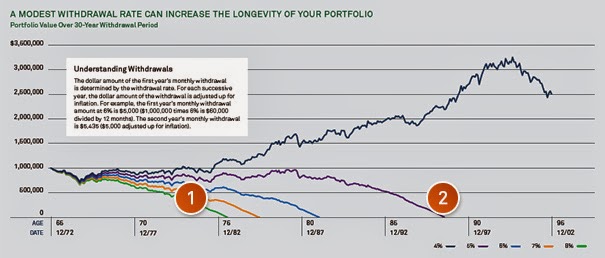 Il grafico qui sotto mostra gli effetti dei piccoli cambiamenti dei tassi di recesso per un portafoglio di un milione di dollari nel periodo di 30 anni a partire da 31 dicembre 1972, prima di un grande calo del mercato.