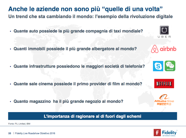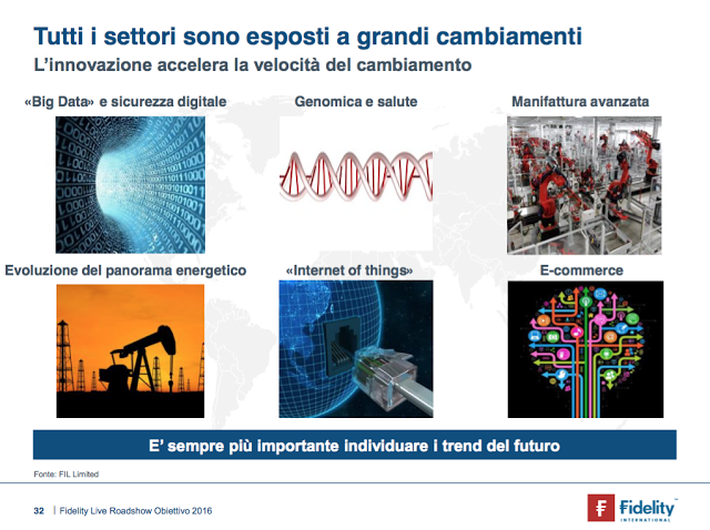 Investire guardando ai cambiamenti diventa una necessità. Se qualcuno non se ne fosse accorto il mondo è cambiato e sta cambiando più velocemente di quanto lo percepiamo. Trovo molto interessanti queste due slide presentate nel road show di Fidelity. Un motivo per riflettere e guardare ai propri investimenti non solo nel breve periodo ma con obiettivi idonei alle proprie esigenze.